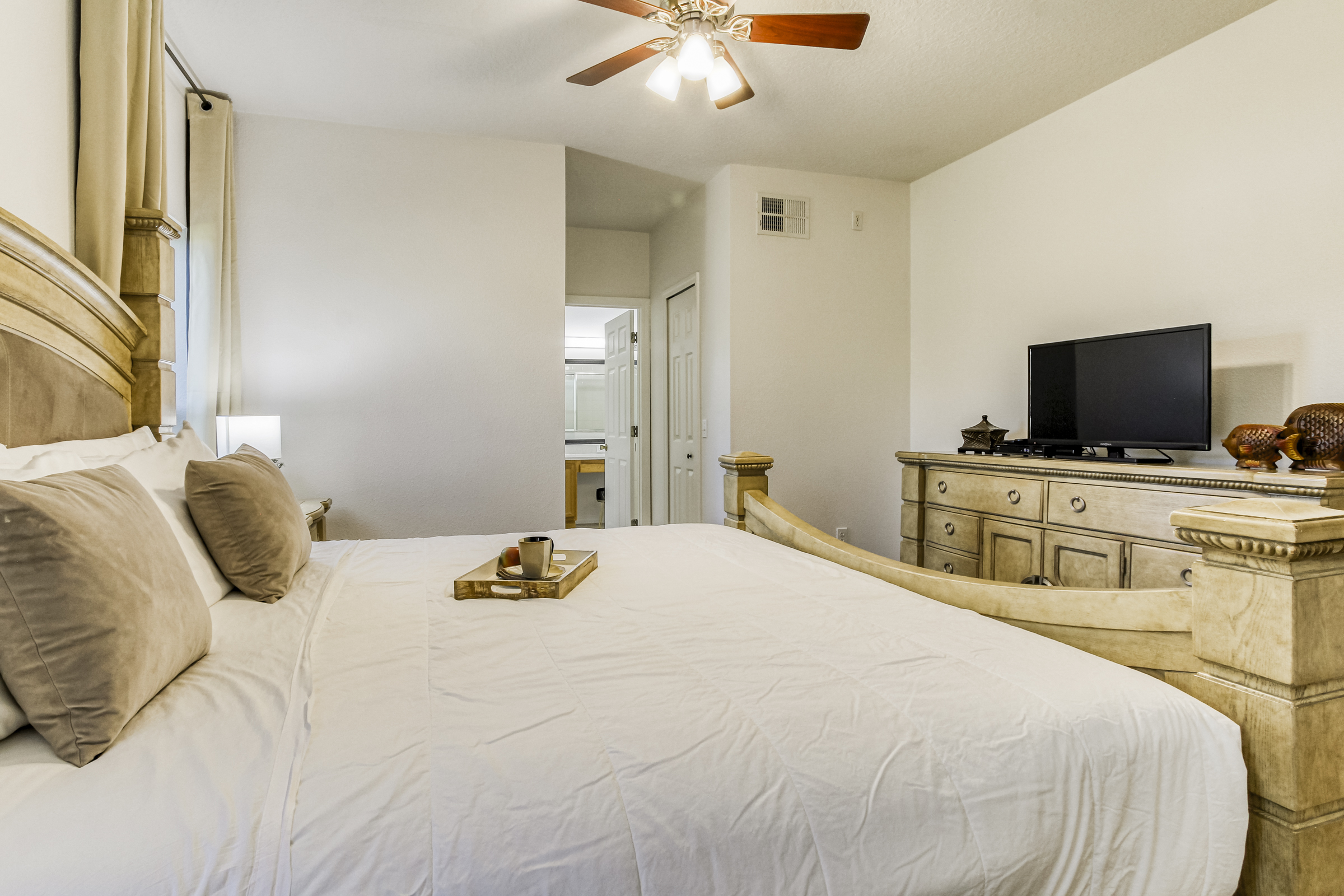 - Amenities: Blackout curtains, Ceiling fan, Direct access to bathroom with bathtub, Flat-screen TV with Roku, Reach in closet with hangers